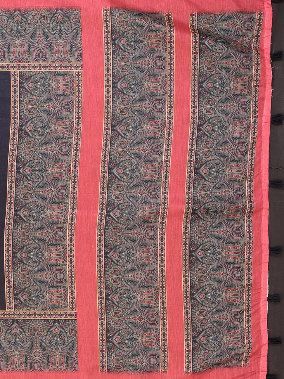 This black saree with a rich reddish-pink border showcases a beautiful blend of traditional and modern appeal. Its intricate printed patterns add charm, making it ideal for festive occasions and cultural gatherings.