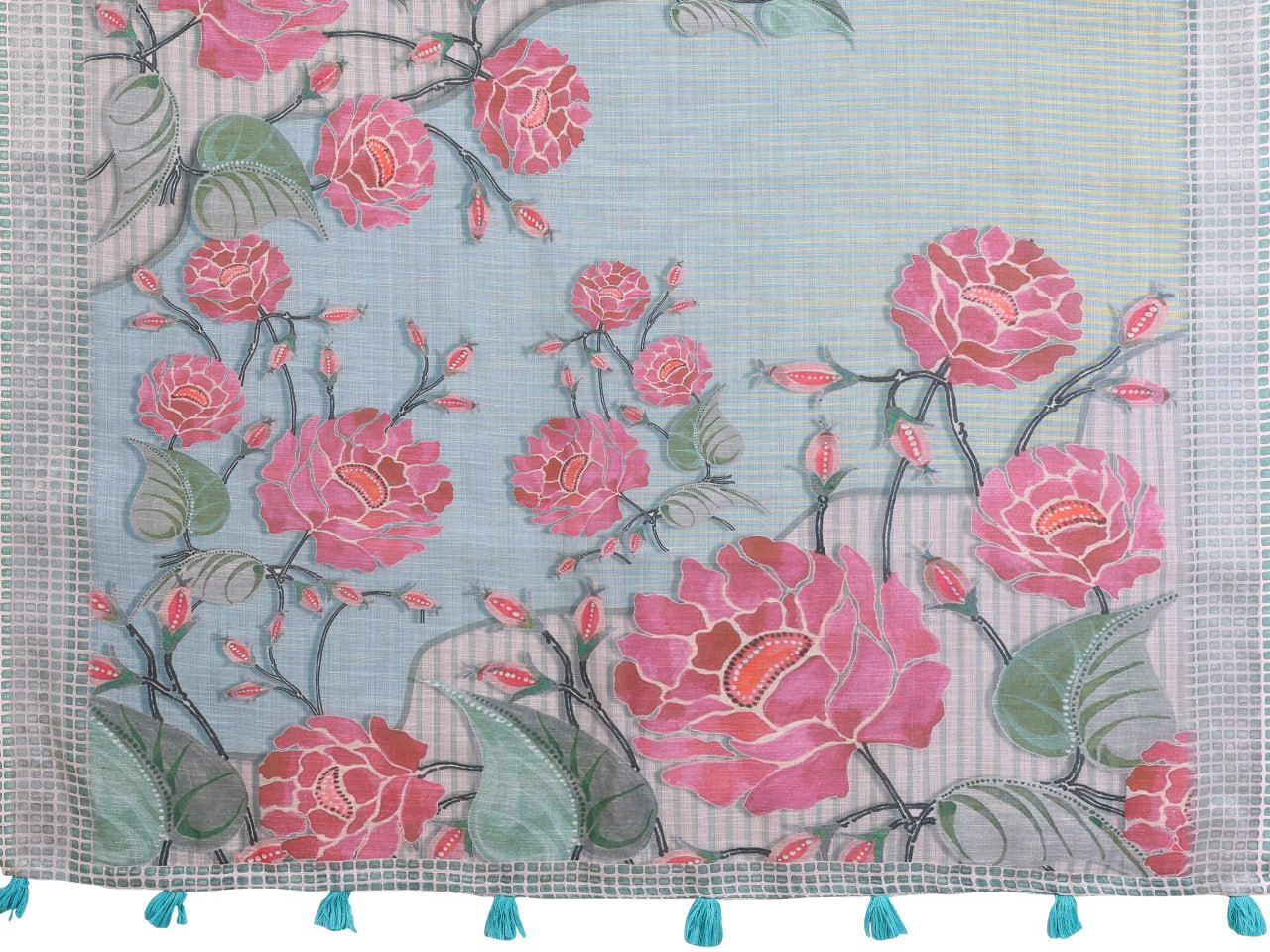 Step into effortless elegance with this grey-blue linen cotton saree, designed for both comfort and sophistication. The lightweight and breathable fabric ensures ease of wear, while the bold pink floral prints add a striking yet graceful touch.