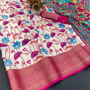 This stylish Chanderi saree features a refreshing green base with rich blue Ikat-inspired motifs, creating a bold yet elegant look. The artistic pallu with traditional designs and tassel finish adds a touch of sophistication, making it a perfect festive pick.