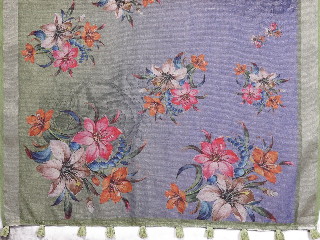 This lavender and green saree exudes elegance with its vibrant floral prints, blending soft pastel tones with striking hues of pink, orange, and white flowers. The dual-tone base adds depth and charm, while the plain matching border with tassel detailing enhances its graceful appeal. Light and breezy, this saree is ideal for festive occasions and daytime gatherings.
